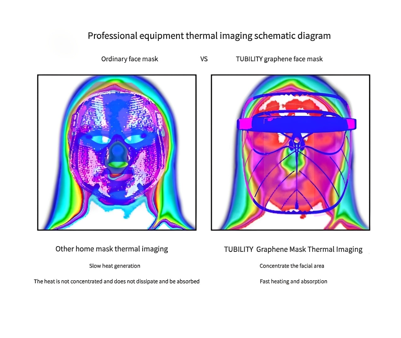 A comparison between the graphene mask of Tubility and the common LED masks on the market. The far-infrared rays released by the graphene mask have wavelengths close to those of the human body, which are easily absorbed by the body and directly reach the dermis layer, activating collagen.